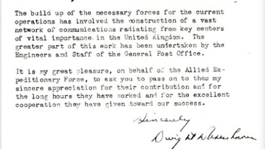 In 1944, the Supreme Commander of the Allied Expeditionary Force in Europe sent a letter to Royal Mail thanking staff for their sterling work during World War Two.