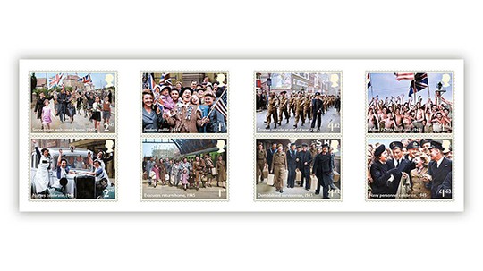 These stamps feature photographs capturing the relief at the conflict’s conclusion and the celebrations that service personnel and evacuated children could return home to rebuild their lives.